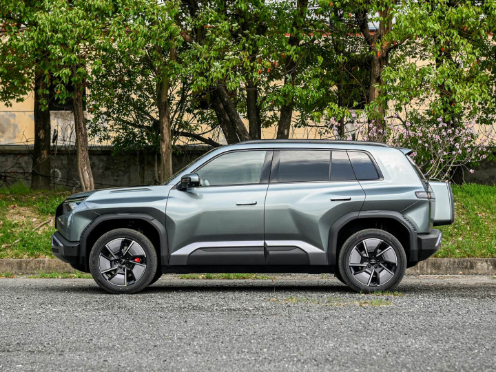 再来看车身侧面部分,车身侧面造型完美诠释“星战曲面”设计理念,硬朗线条与流体曲面巧妙融合。新车车身尺寸为4605×1900×1720mm,轴距达2745mm,在紧凑型SUV阵营中优势明显,为车内空间提供充足保障。车顶线条从B柱后缓缓下沉,营造出优雅溜背姿态,搭配凌厉的“刀锋式”腰线,勾勒出饱满且富有力量感的侧围轮廓。轮拱采用一体化锻造铝合金材质,表面覆盖哑光黑防刮涂层,边缘锋刃式导流槽可减少高速乱流,30mm的轮拱间隙确保轻度越野通过性。