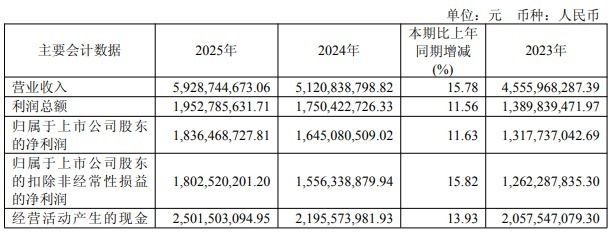 公司2025年度利润分派方案(预案)为:以实施权益分派股权登记日登记的总股本扣减公司回购专用证券账户中的股份为基数,拟向全体股东每10股派发现金红利12.5228元(含税)。以此计算合计拟派发现金红利580,017,310.38元(含税)。该预案尚需提交股东会审议,实际分派的金额以公司发布的权益分派实施公告为准。