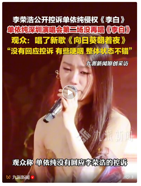 3月29日,歌手单依纯因28日在“纯妹妹2.0”深圳演唱会上未经授权翻唱李荣浩的作品《李白》,陷入版权侵权风波,引发李荣浩公开质问及行业对版权问题的热议。