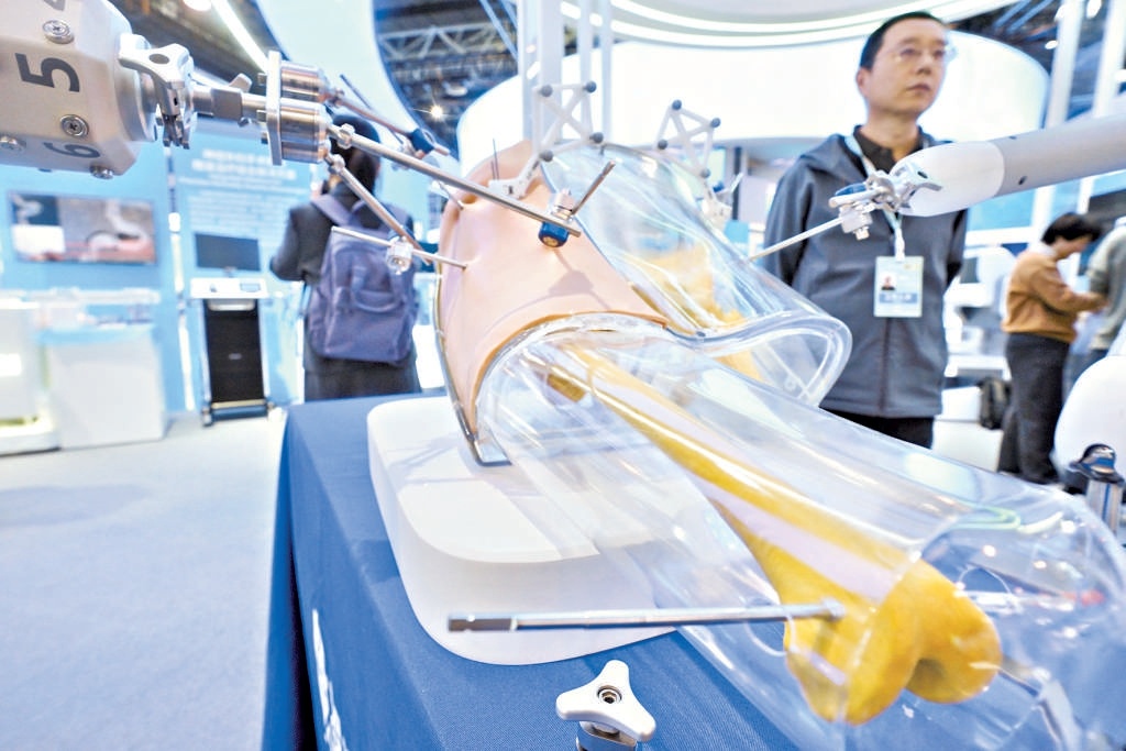 北京罗森博特科技有限公司推出的智能化骨科手术机器人系统基于统计学模型的自动规划算法,3分钟即可快速完成手术规划。系统具备全程实时动态三维可视化导航,高精度光学追踪实现亚毫米级定位。160N强劲机械臂载荷,提供力位协同控制,可自动执行手术操作。该系统真正实现骨科手术全自动、全流程数智化微创治疗,显著提升手术精准度与安全性。北京日报记者 程功摄
